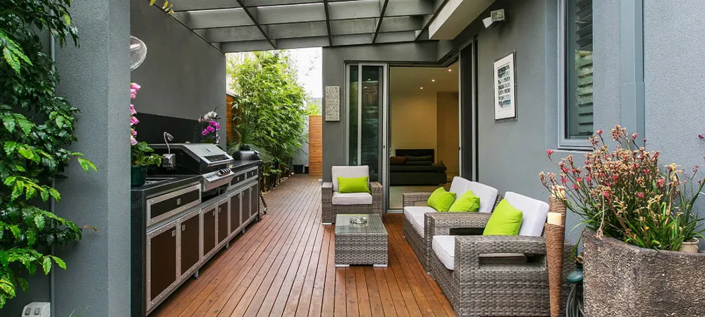 Если большая веранда открытая на даче, дизайн фото которых мы также подобрали для вас, то лучше расставлять мебель ближе к стене дома. При этом важно чтобы стена стала также элементом дизайна. Можно ее отделать ДПК панелями в цвет полу или элементам декора.